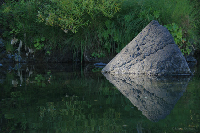 Producing landscapes reflected in moving water can produce images akin to great impressionist paintings. The more the water moves, the more abstract the landscape becomes. In extreme examples, the reflected landscape can lose it’s visual narrative and the viewer can become confused. Placing a still object in the composition, a log, a overhanging tree branch can add scale and familiarity with the reflection.
